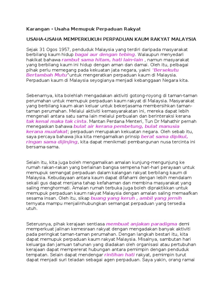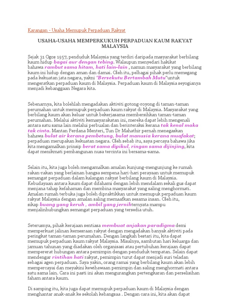 Contoh Karangan Kepentingan Perpaduan Kaum Di Malaysia Pdf 26499208 Contoh Karangan 1 Doc Usaha Usaha Mewujudkan Perpaduan Kaum Di Malaysia Norhafiza Mohd Aziz Academia Edu. Diperoleh jika perpaduan kaum dapat dikukuhkan dalam kalangan masyarakat. Contoh Karangan Usaha-Usaha Memupuk Perpaduan Kaum Di Malaysia Isu perpaduan kaum merupakan satu usaha berterusan yang perlu dipikul dan dijunjung bersama-sama oleh semua pihak.